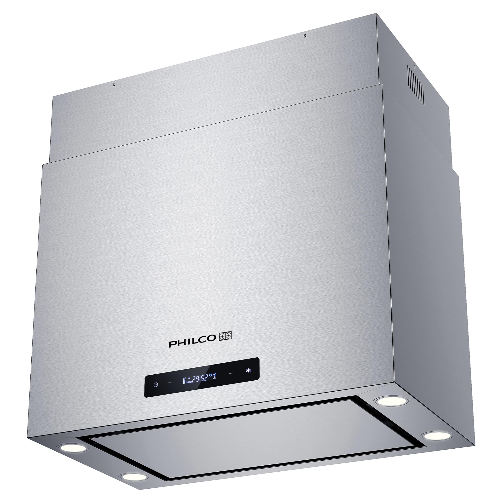 Okap wyspowy ze stali nierdzewnej Philco PEI 62 CUBE z klasą efektywności energetycznej A, 4 poziomy mocy, wyświetlacz LED i sterowanie dotykowe.