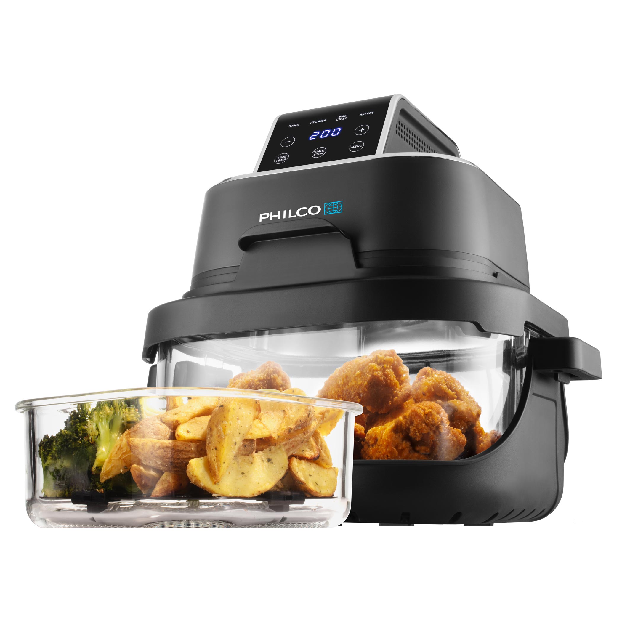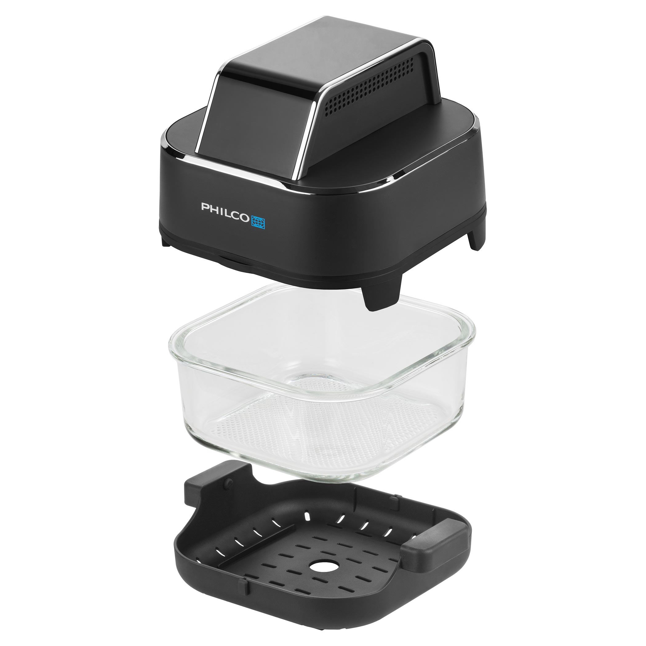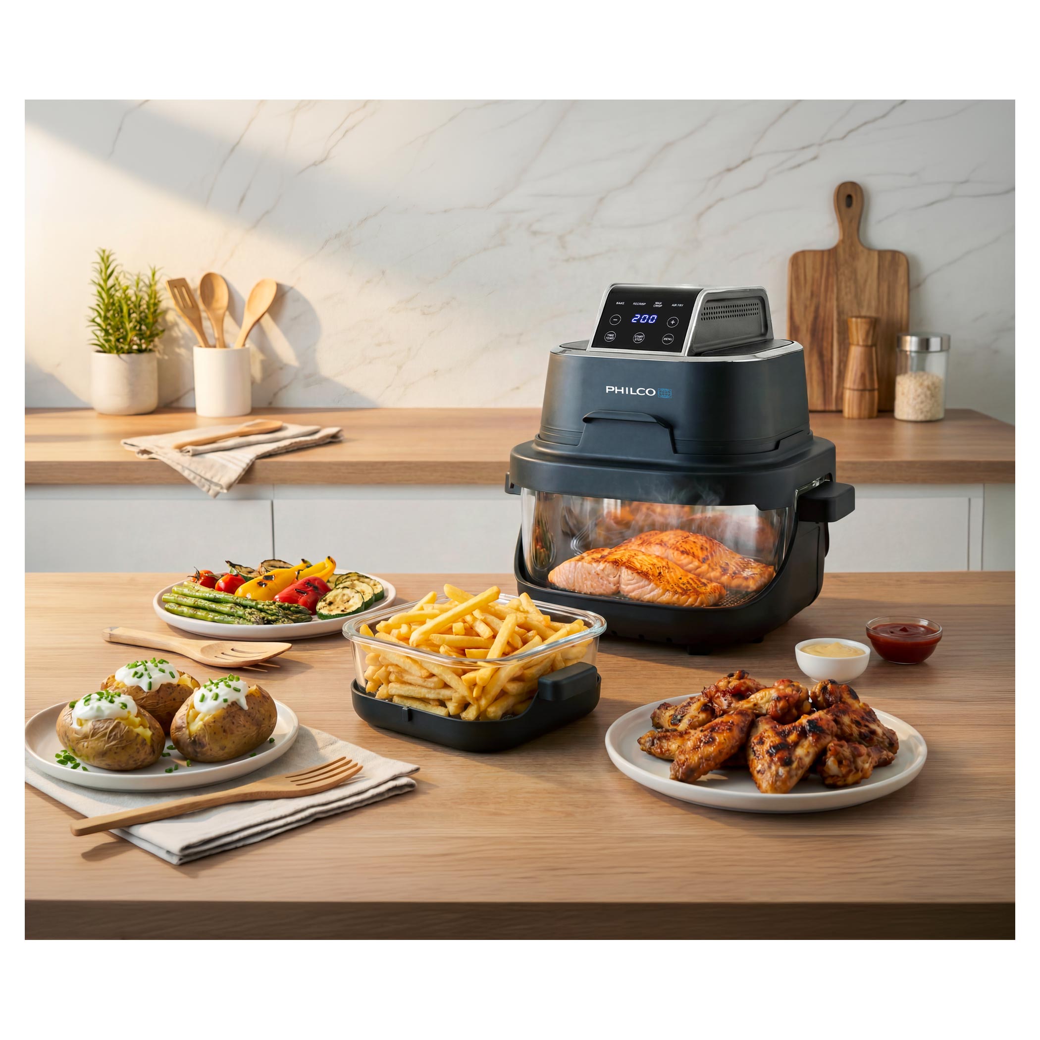 Frytkownica beztłuszczowa Philco PHAF 2005 Fry&Go nauczy Cię gotować szybko, sprytnie i bez marnowania resztek. Rozszerza naszą szklaną serię frytkownic Glassio, stworzoną z myślą o inteligentnym, przejrzystym i zrównoważonym gotowaniu. Dzięki wytrzymałemu szklanemu naczyniu możesz gotować bezpiecznie przez długi czas - bez ścierania powierzchni oraz przenikania smaków i zapachów. Widoczność 360° pozwala obserwować potrawy podczas przygotowania, dzięki czemu dokładnie wiesz, kiedy są gotowe i że nic się nie przypala. Frytkownica wyposażona jest w 2 naczynia: duże o pojemności 4 l do głównych dań oraz małe o pojemności 1,5 l na dodatki.