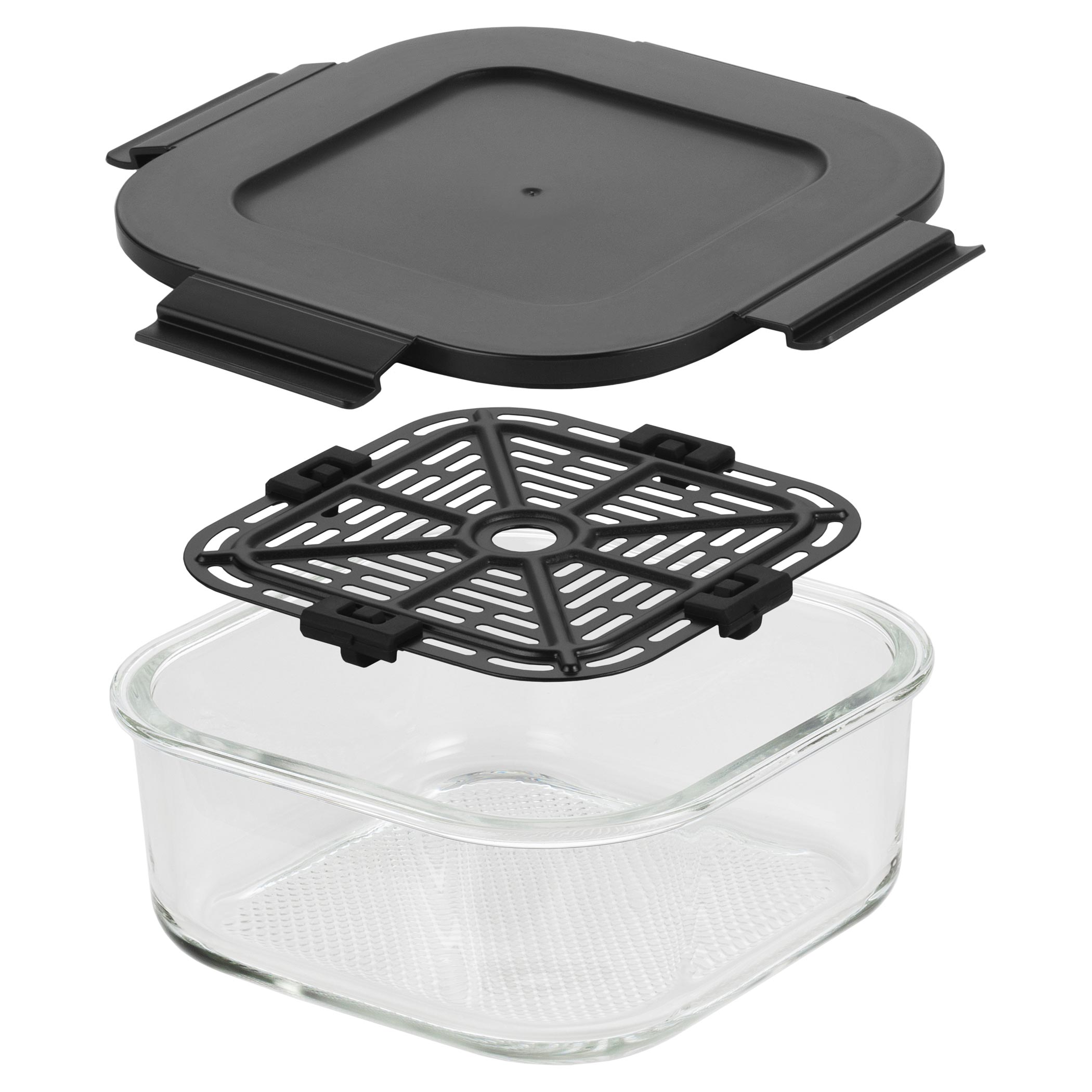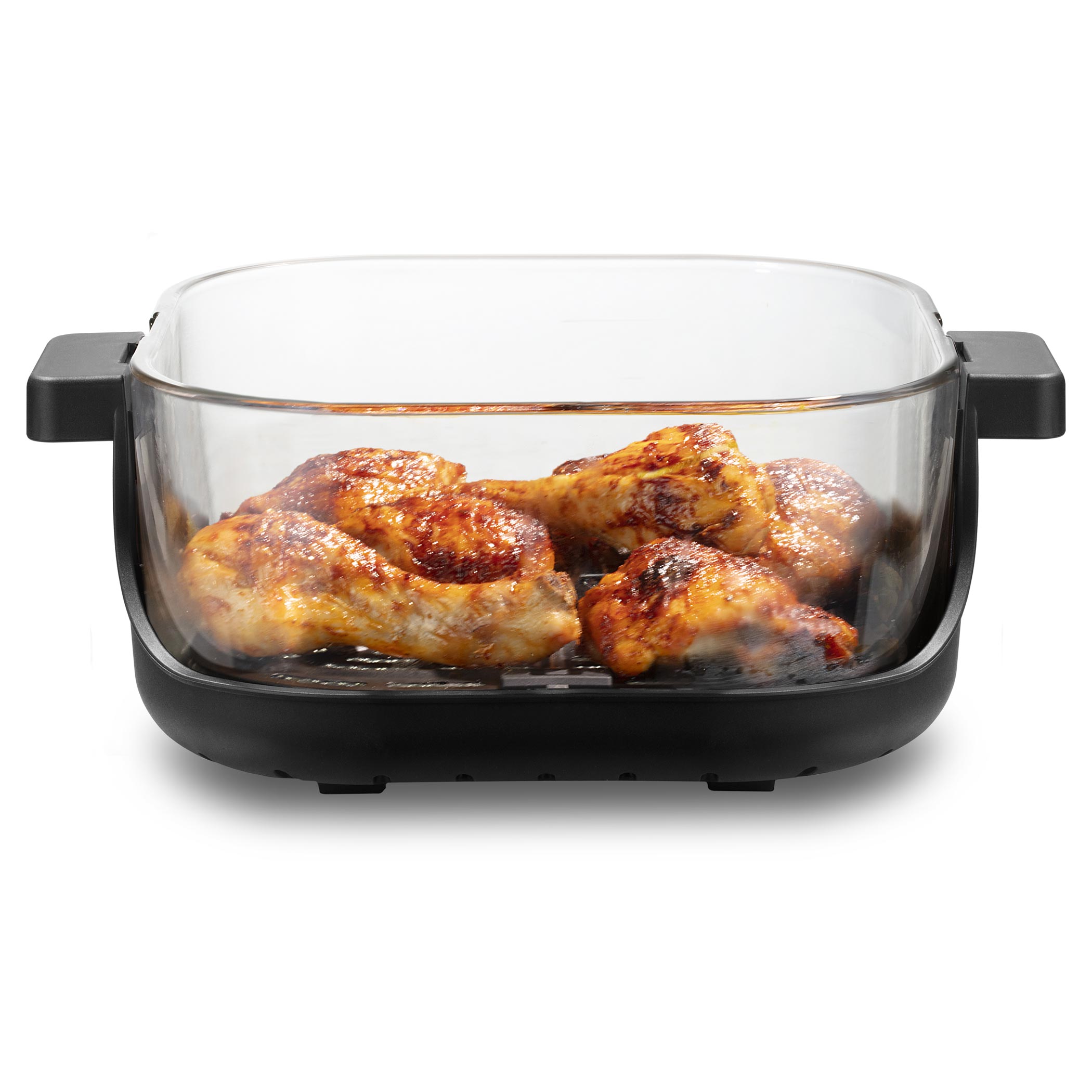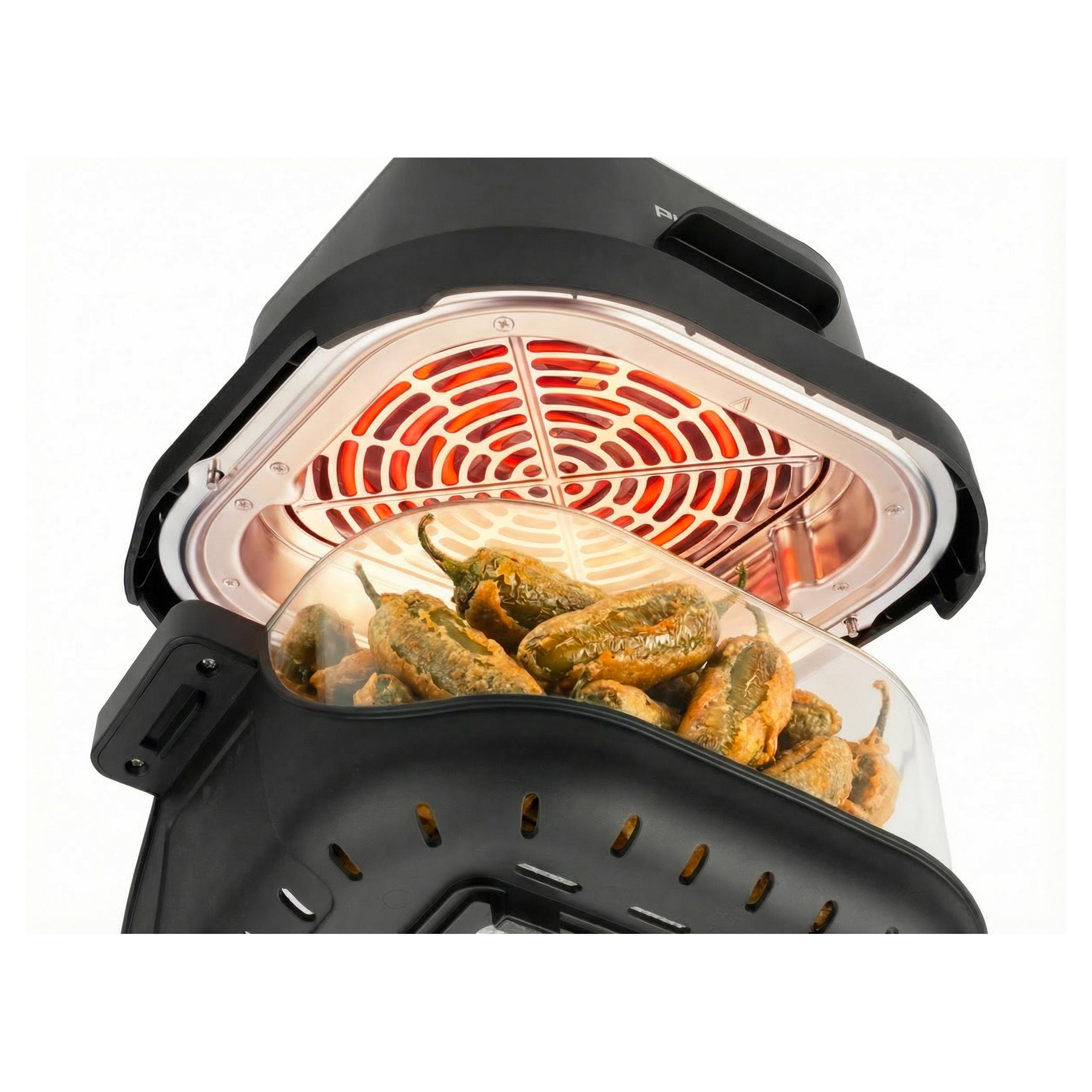 Każde naczynie posiada uchwyt z rączkami i po ugotowaniu może być używane bezpośrednio jako szklane naczynie do serwowania na stół. Posiada również pokrywkę, dzięki której można je zamknąć i po ostygnięciu przechowywać w lodówce lub zabrać ze sobą, np. do pracy. Frytkownica została zaprojektowana tak, że cała jednostka grzewcza nakładana jest od góry na wybrane naczynie. Wystarczy włożyć jedzenie do naczynia, założyć jednostkę grzewczą, ustawić jeden z 4 trybów na panelu dotykowym i obserwować przygotowanie potrawy. Możesz korzystać z klasycznego smażenia gorącym powietrzem, pieczenia, ekstra chrupiącego pieczenia oraz funkcji podgrzewania z efektem chrupkości, dzięki której wczorajsze danie po odgrzaniu będzie przyjemnie chrupiące.