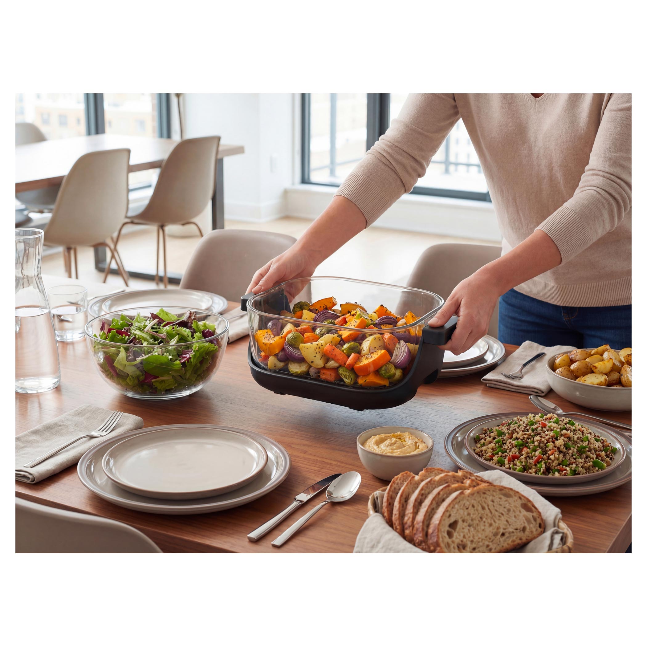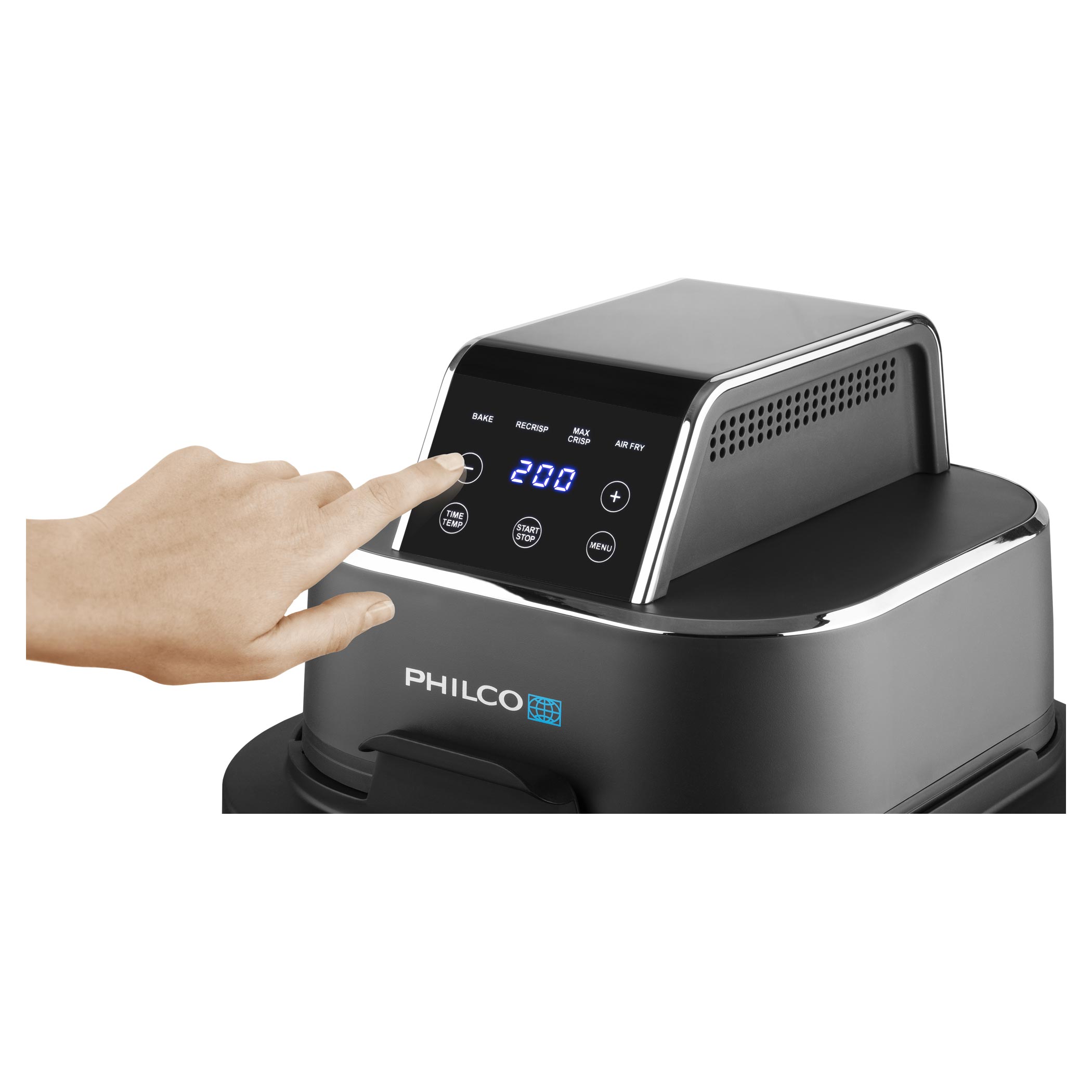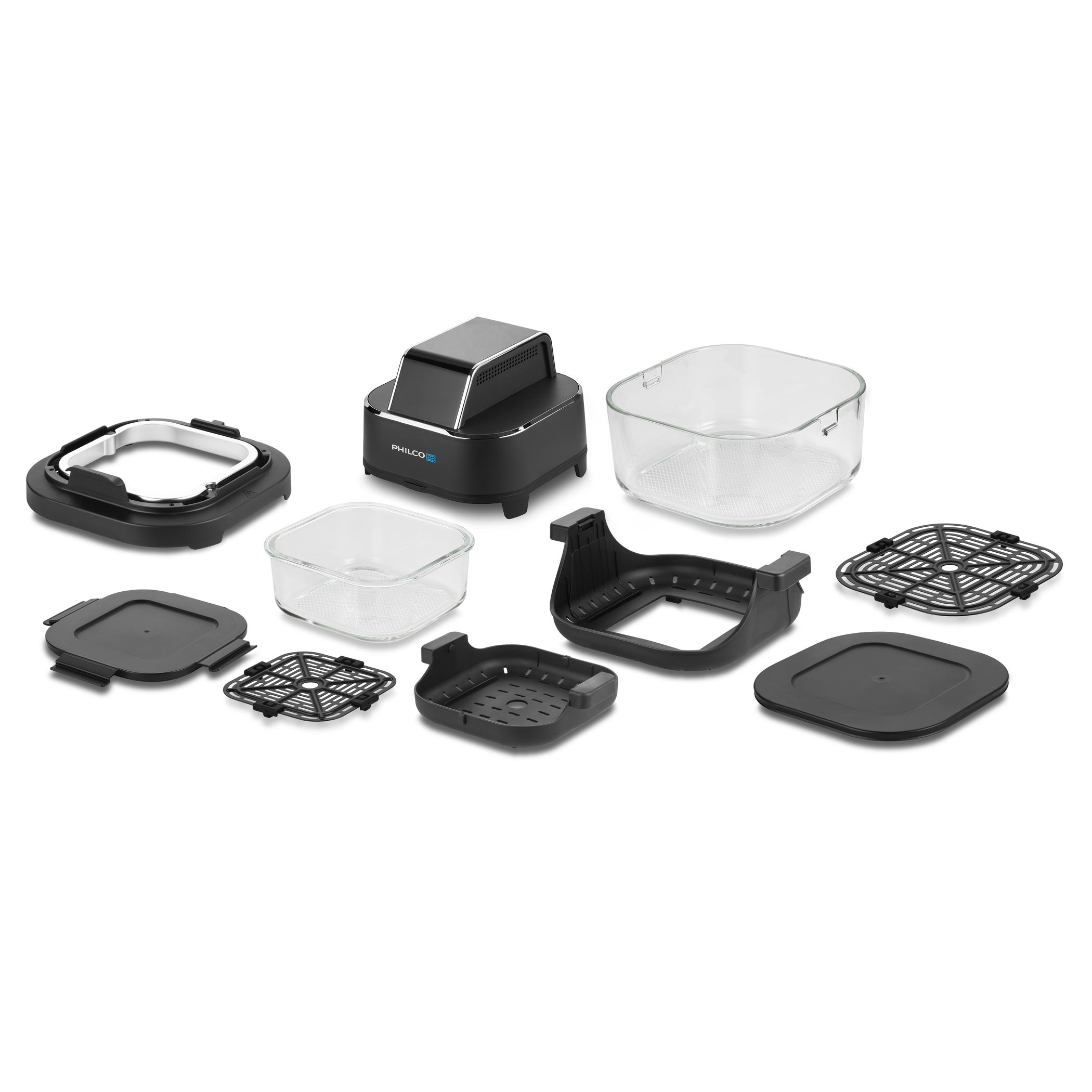 Każde naczynie posiada uchwyt z rączkami i po ugotowaniu może być używane bezpośrednio jako szklane naczynie do serwowania na stół. Posiada również pokrywkę, dzięki której można je zamknąć i po ostygnięciu przechowywać w lodówce lub zabrać ze sobą, np. do pracy. Frytkownica została zaprojektowana tak, że cała jednostka grzewcza nakładana jest od góry na wybrane naczynie. Wystarczy włożyć jedzenie do naczynia, założyć jednostkę grzewczą, ustawić jeden z 4 trybów na panelu dotykowym i obserwować przygotowanie potrawy. Możesz korzystać z klasycznego smażenia gorącym powietrzem, pieczenia, ekstra chrupiącego pieczenia oraz funkcji podgrzewania z efektem chrupkości, dzięki której wczorajsze danie po odgrzaniu będzie przyjemnie chrupiące.