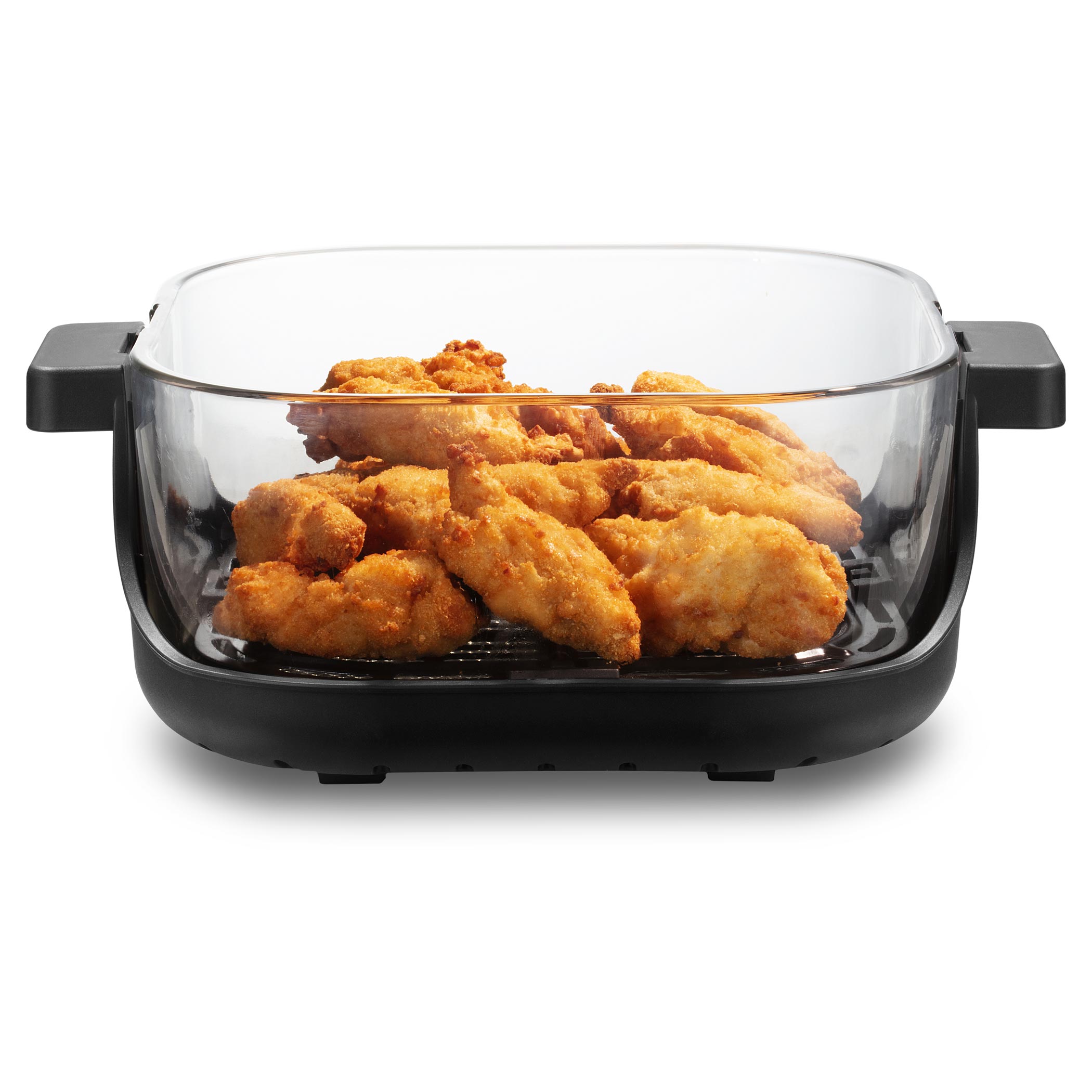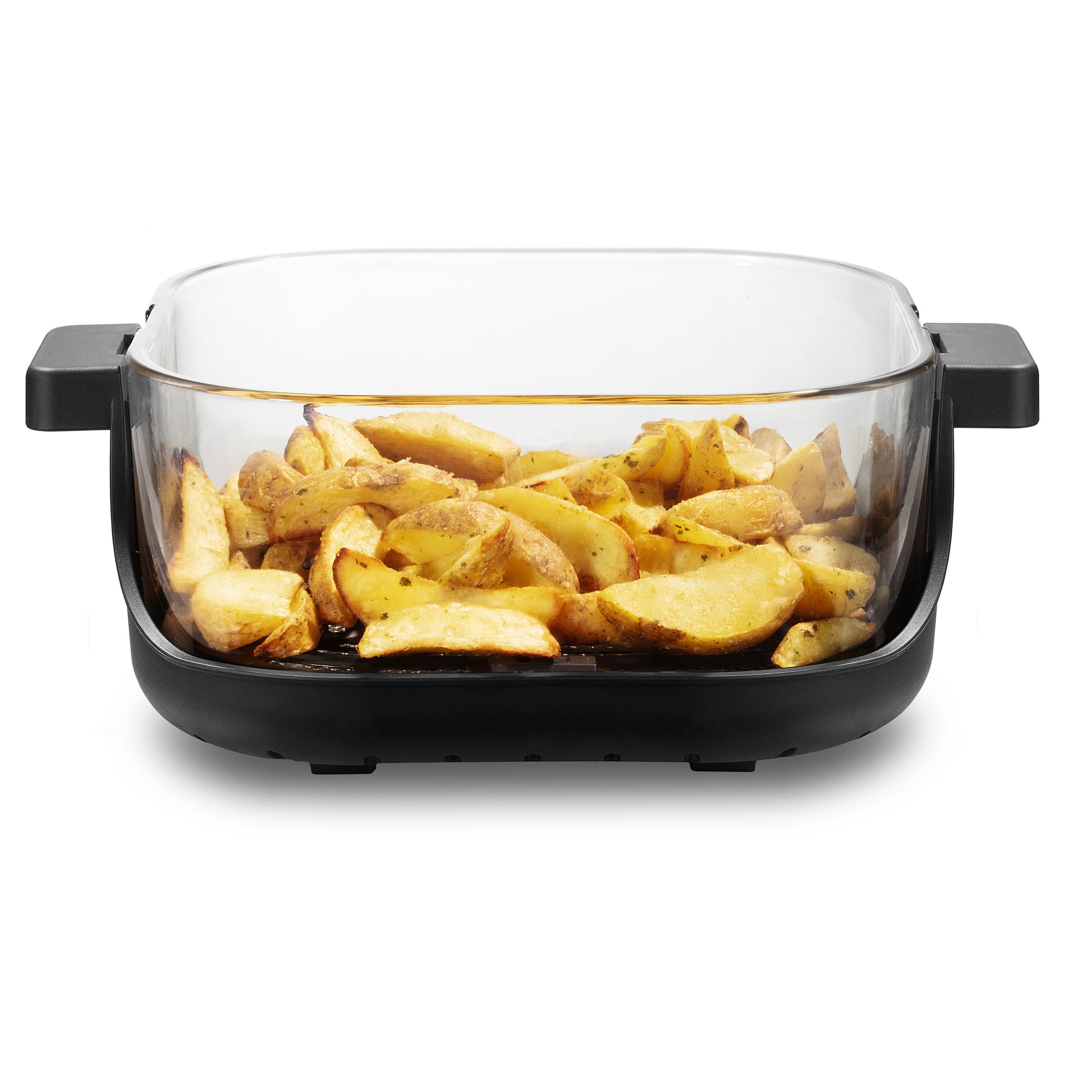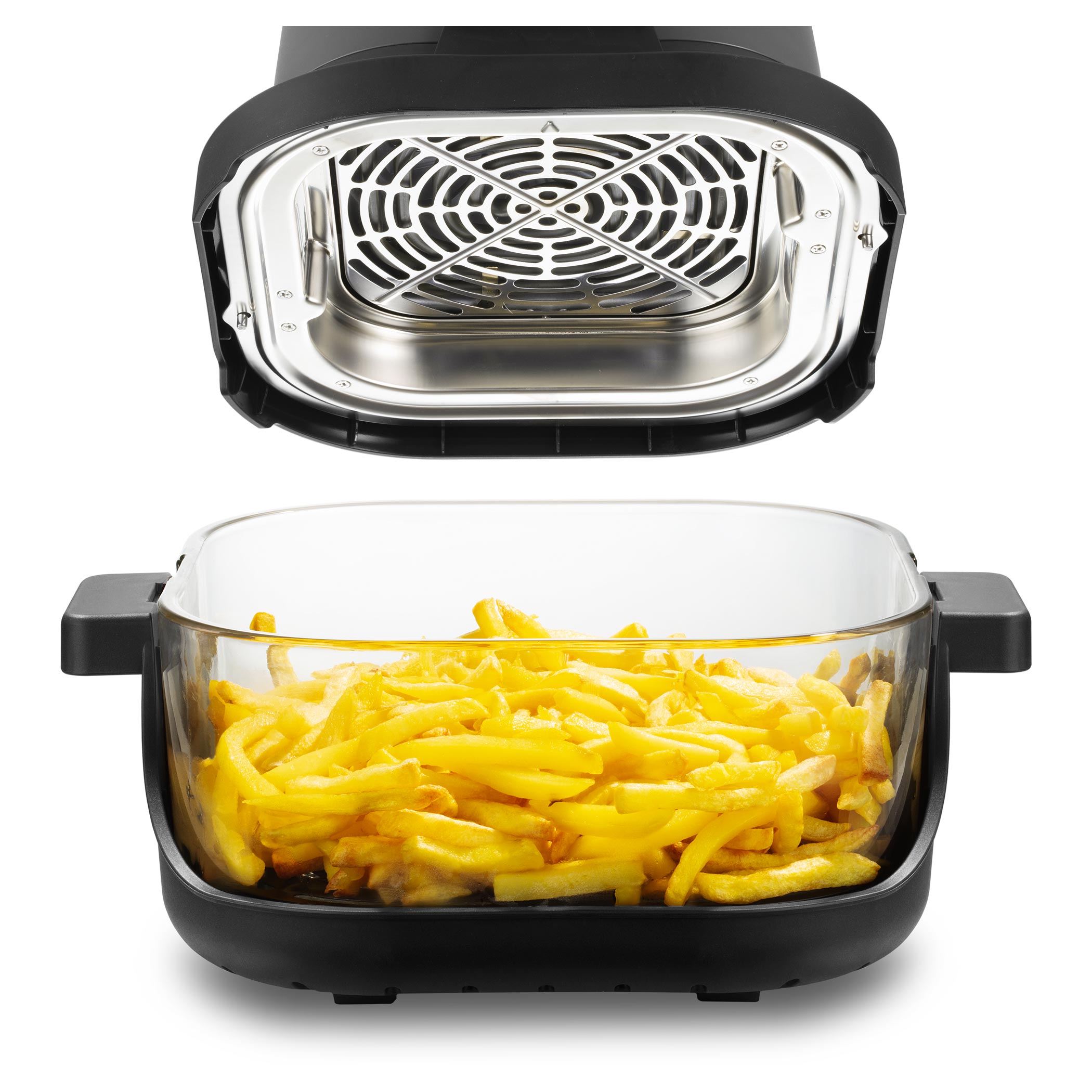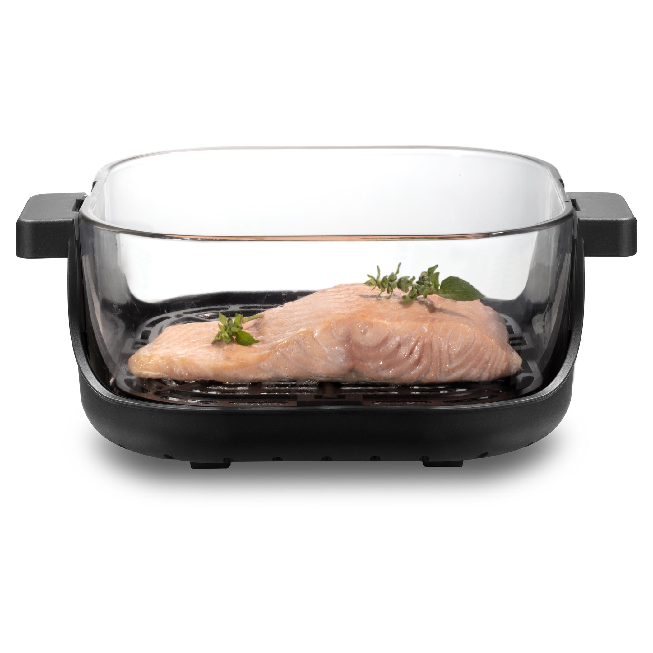 Zdrowe, szklane naczynie bez powłoki jest bezpieczne do codziennego użytkowania i nie pochłania zapachów ani smaków. Dodatkowo możesz obserwować cały proces przygotowania, co daje większą kontrolę i przyjemność z gotowania. Jednostkę grzewczą łatwo zakłada się od góry na wybrane naczynie – bez skomplikowanej obsługi. Po zakończeniu wystarczy chwycić naczynie za uchwyty. Potrawę można od razu podać lub wstawić do lodówki. Unikalny system Fry&Go eliminuje potrzebę używania dodatkowych naczyń.