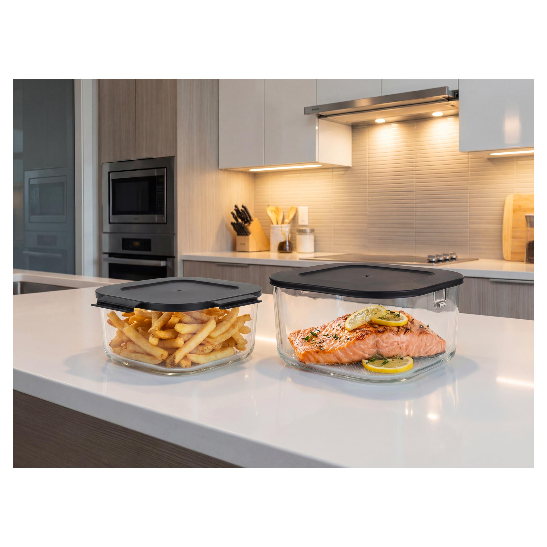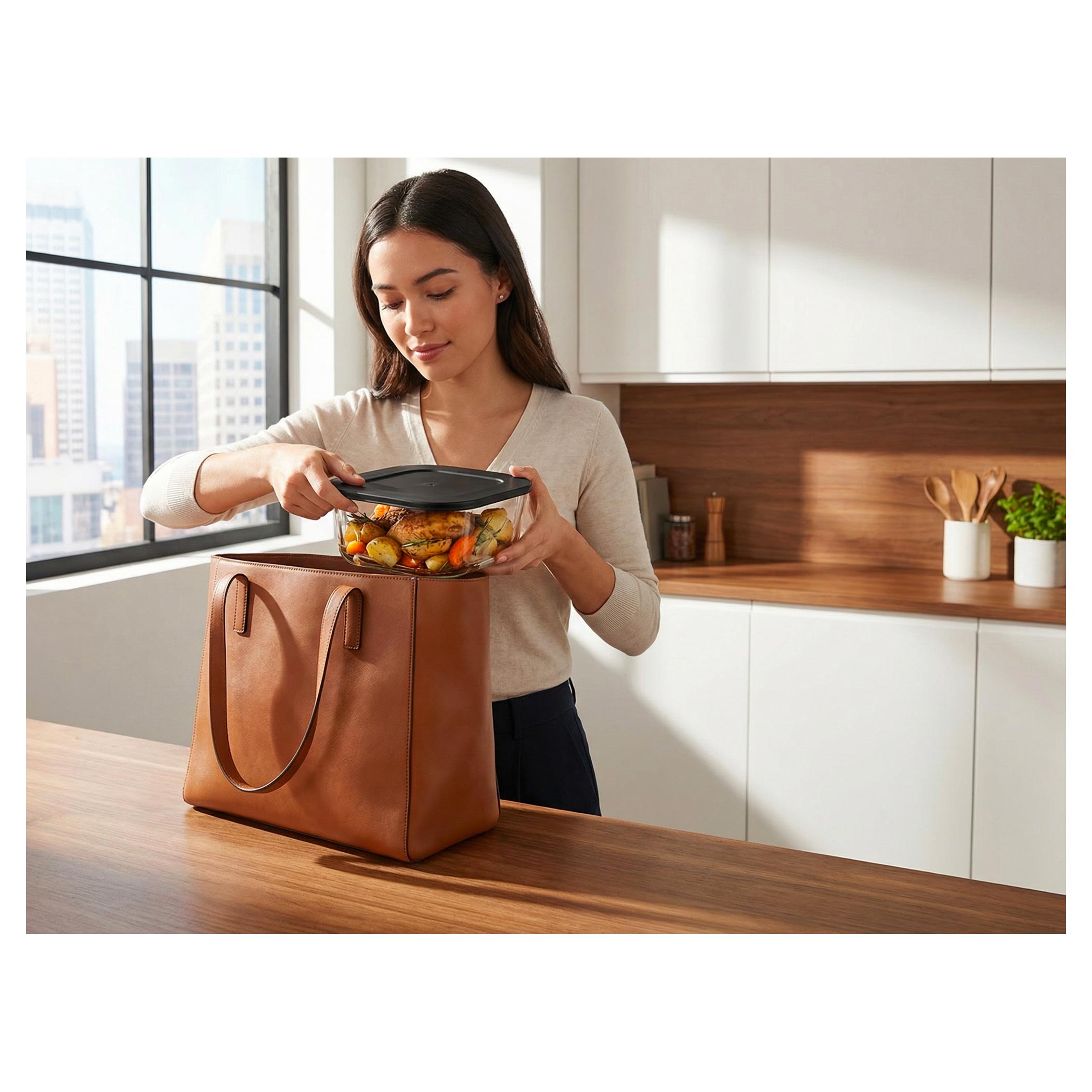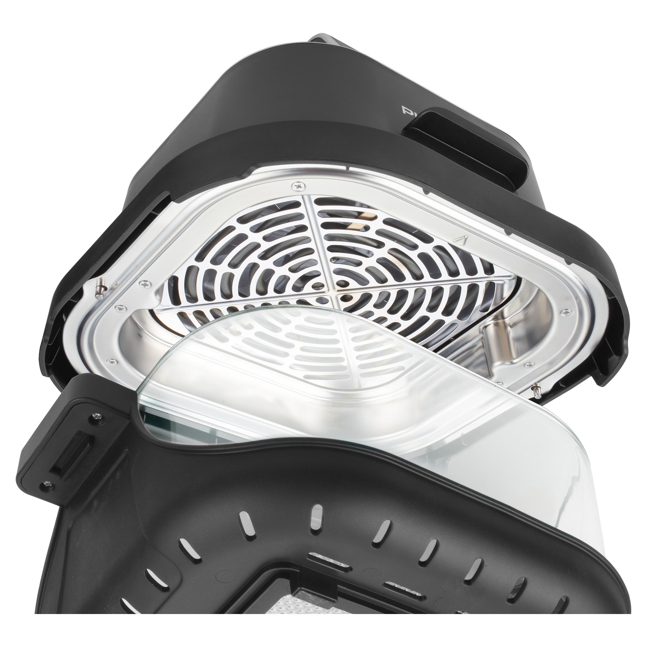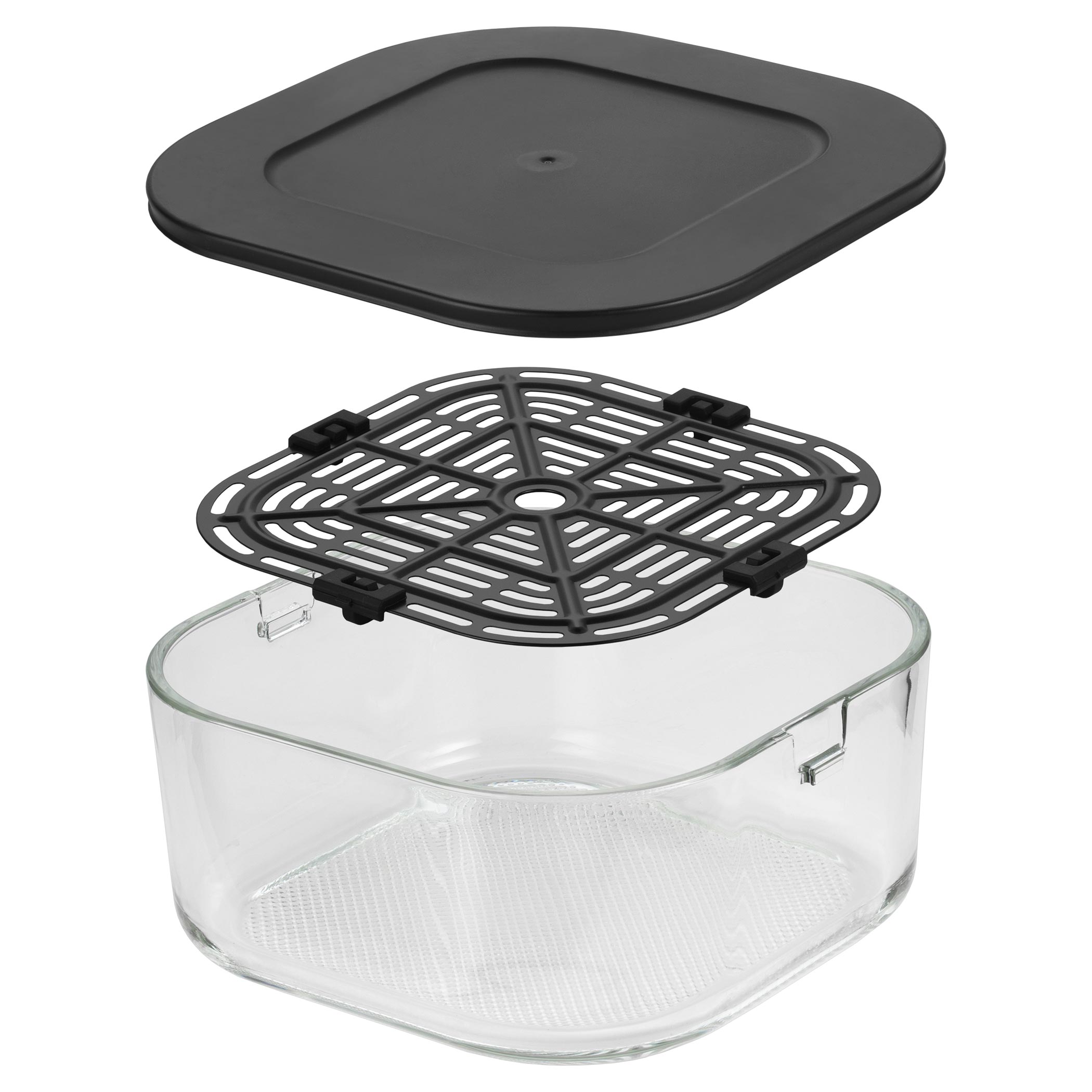 Zdrowe, szklane naczynie bez powłoki jest bezpieczne do codziennego użytkowania i nie pochłania zapachów ani smaków. Dodatkowo możesz obserwować cały proces przygotowania, co daje większą kontrolę i przyjemność z gotowania. Jednostkę grzewczą łatwo zakłada się od góry na wybrane naczynie – bez skomplikowanej obsługi. Po zakończeniu wystarczy chwycić naczynie za uchwyty. Potrawę można od razu podać lub wstawić do lodówki. Unikalny system Fry&Go eliminuje potrzebę używania dodatkowych naczyń.