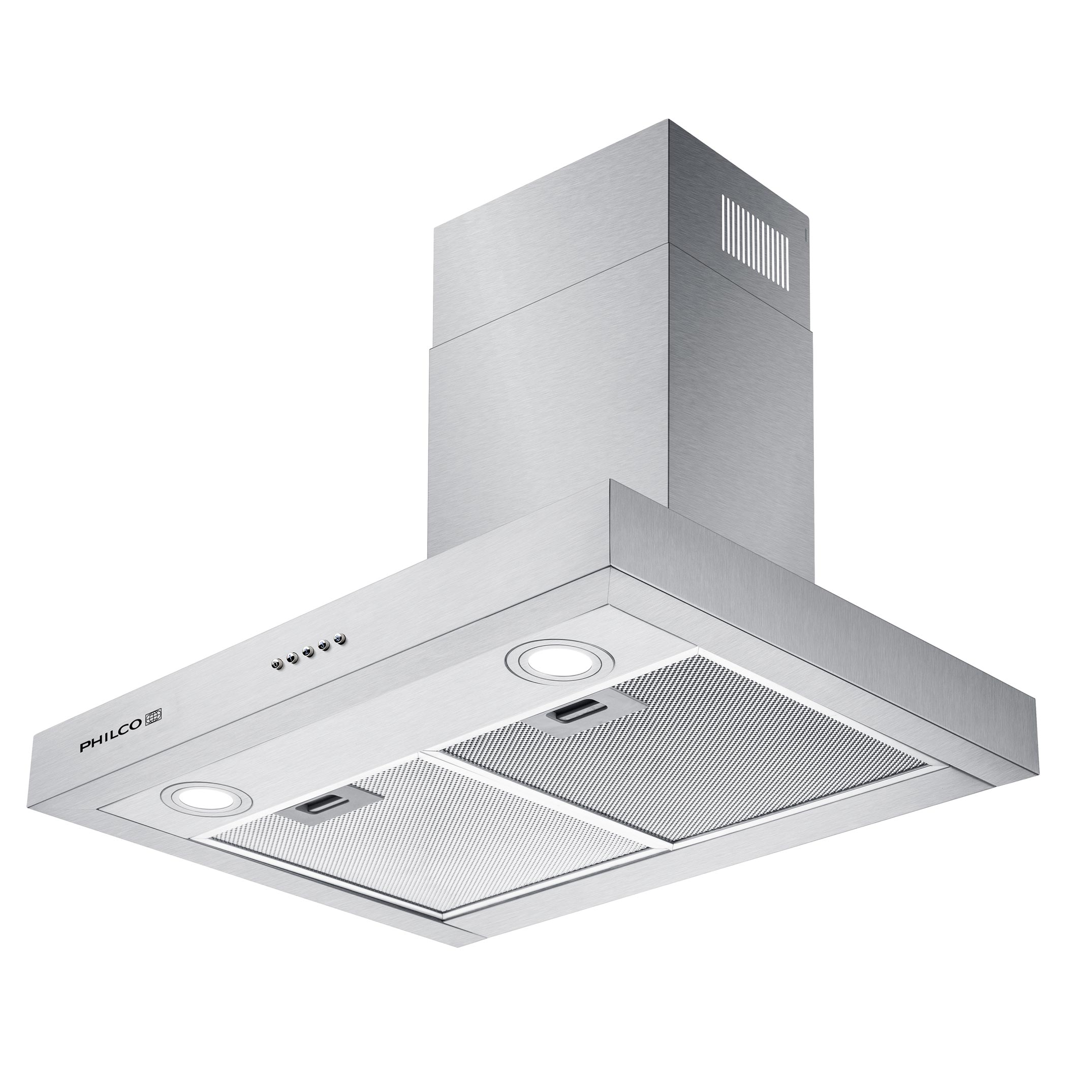 Wyciąg kominowy Philco PEW 306 T, konstrukcja ze stali nierdzewnej, sterowanie przyciskiem i oświetlenie LED, klasa efektywności energetycznej C.